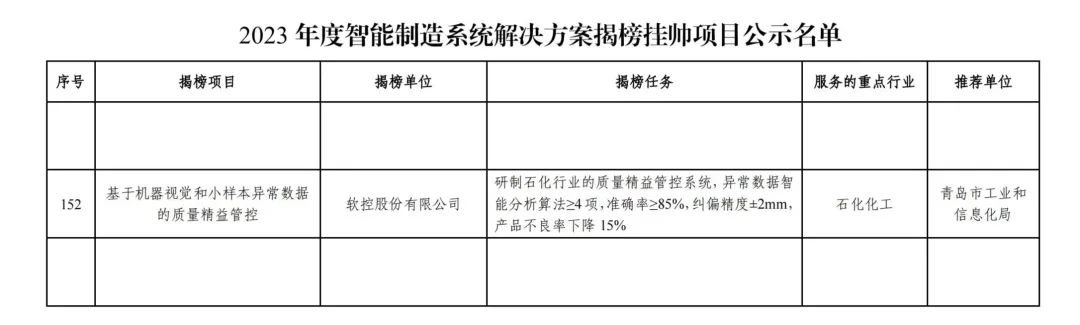 近日,軟控股份有限公司的“基于機(jī)器視覺和小樣本異常數(shù)據(jù)的質(zhì)量精益管控”成功入選國家工信部“2023年度智能制造系統(tǒng)解決方案揭榜掛帥項(xiàng)目”。