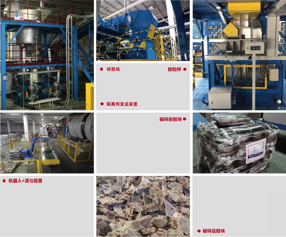 • 本系統用于將生產所用的標準膠塊進行破碎、混勻,從源頭保證原材料物性的均一,從而保證最終產品質量的穩定。