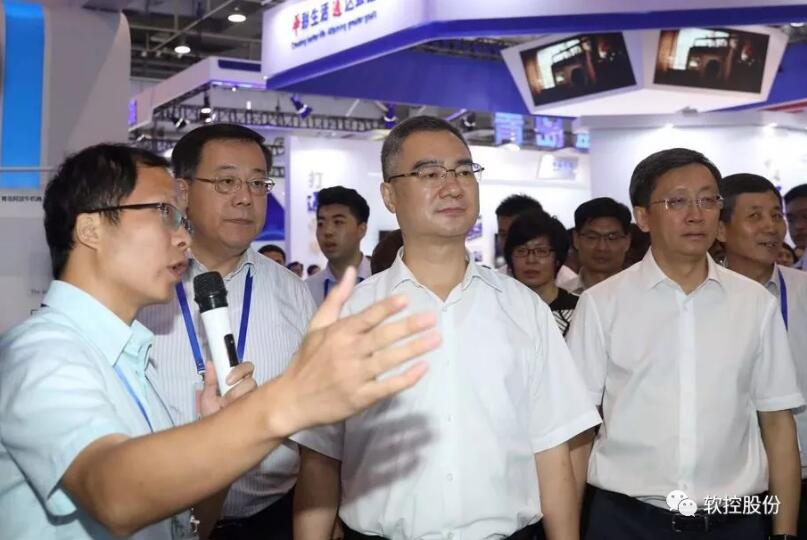 7月27日上午,在2019青島國際軟件創新融合博覽會上,山東省委常委、青島市委書記王清憲在青島市委常委、常務副市長薛慶國,高新區工委副書記、管委主任尚立群,青島市工信局局長姜波等領導陪同下蒞臨高新區展區軟控股份展位。