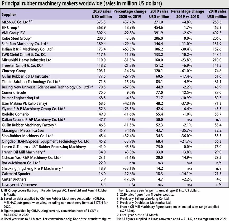最新出版的歐洲橡膠雜志(European Rubber Journal) 5/6月刊更新了2020年全球橡膠機械行業企業的銷售收入排名,軟控(MESNAC)位居第一。