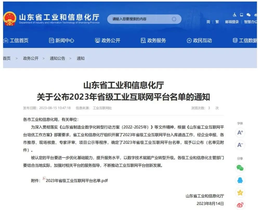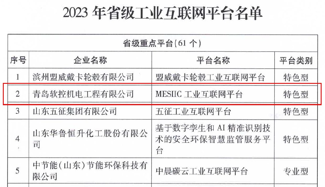 8月14日,山東省工業和信息化廳公布2023年省級工業互聯網平臺名單,青島軟控機電工程有限公司的“MESIIC工業互聯網平臺”成功入選省級重點平臺(特色型)。